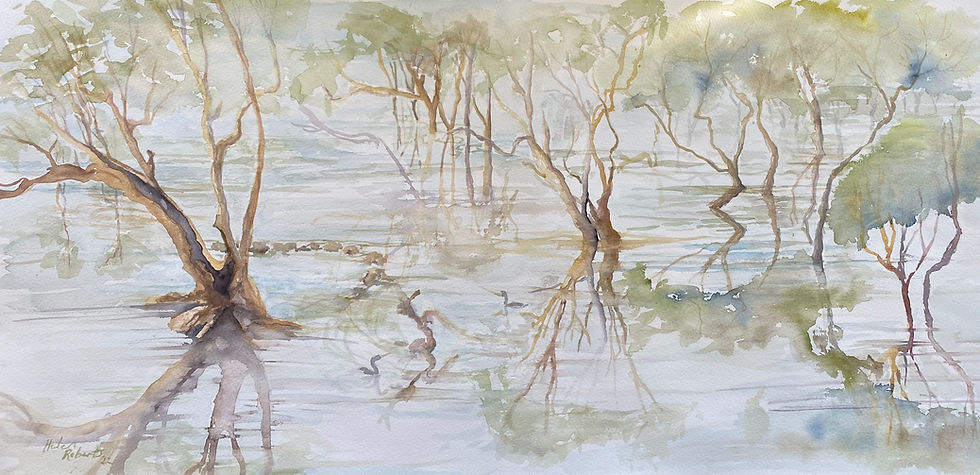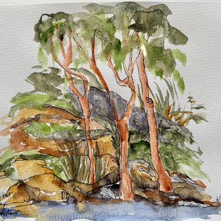 Most of my paintings fall into this category because the combination contains many interesting textures and elements. Light falling through the trees, creating shade on rocks or water! The contrast of smooth barked Angophoras with the rough and uneven textures of sandstone! Rippling water flowing past Grey Mangrove trees with their feet still in the water!